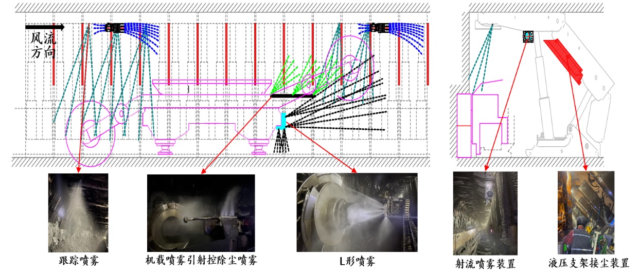 榆神矿区是我国重要的煤炭生产基地,拥有大量千万吨级矿井,普遍选用大采高综采、快速掘进生产工艺,自动化程度和生产效率极高,有力地保障了我国的能源供给,但目前井下作业区域粉尘灾害严重却无有效防治和管控手段,呼吸性粉尘浓度可达100mg/m3以上,卫生条件恶劣、安全保障性差、员工幸福感低,已经成为严重制约榆神矿区矿井高效生产和健康发展的关键难题。