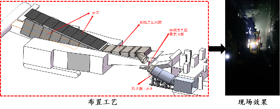 (2)研发了快掘面“立体喷雾抑尘+机载通风控除尘”的粉尘防治成套工艺,研制了两种大风量、高负压机载式除尘系统用于匹配当前主流快掘装备,实现了掘锚机截割滚筒的立体喷雾密闭、高浓度含尘气流的有序控制和高效抽吸净化,最终实现了快掘面粉尘的有效治理,保障了快掘装备的高效作业。